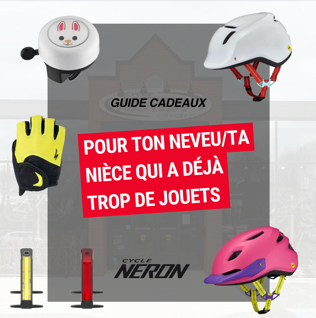 Des cadeaux durables pour les jeunes cyclistes : cloche Crazy Critter, gants Specialized, lumières Knog Plus, casques Shuffle 2 et Mio 2 MIPS.