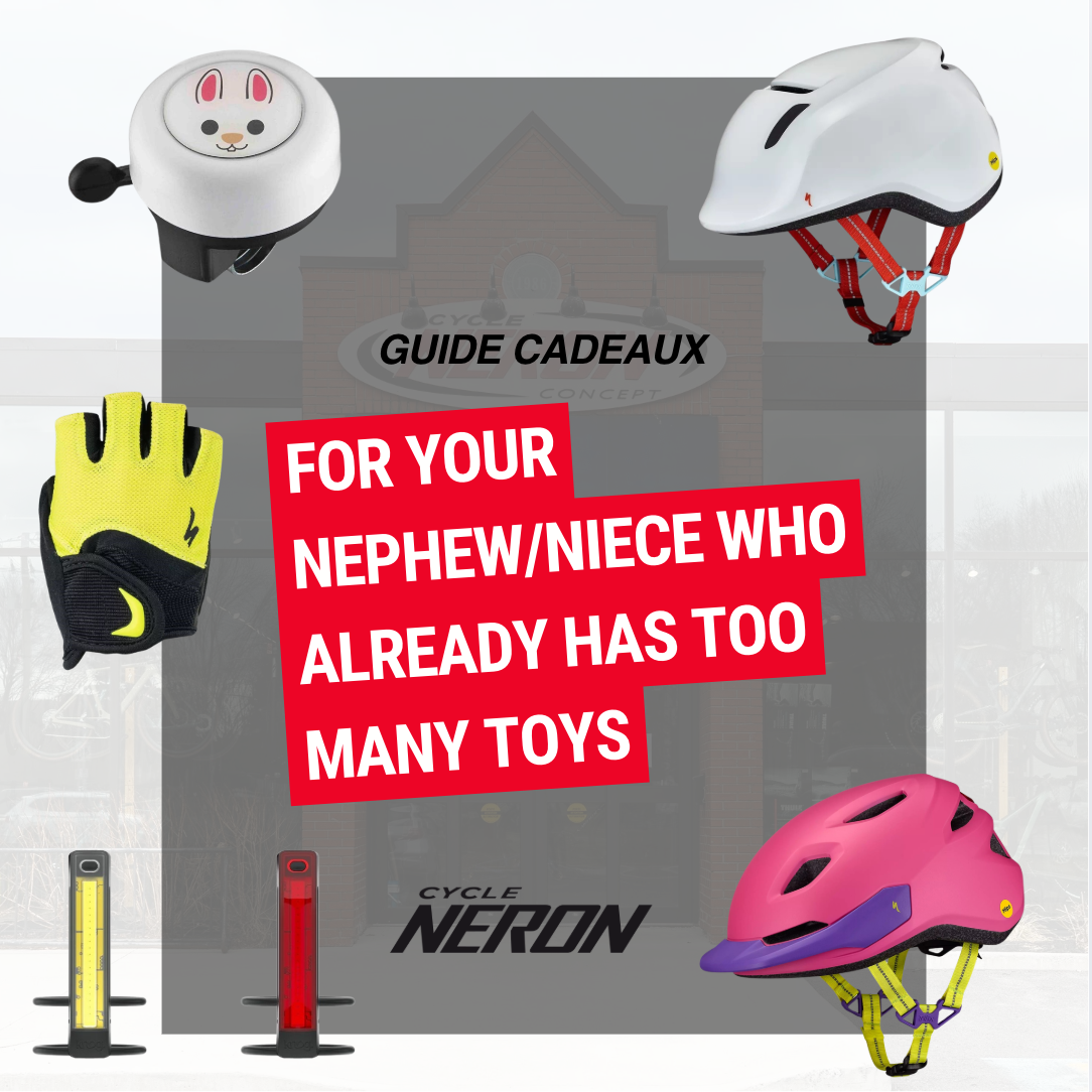 Durable gifts for young cyclists: Crazy Critter bell, Specialized Kids gloves, Knog Plus lights, Shuffle 2 and Mio 2 MIPS helmets.