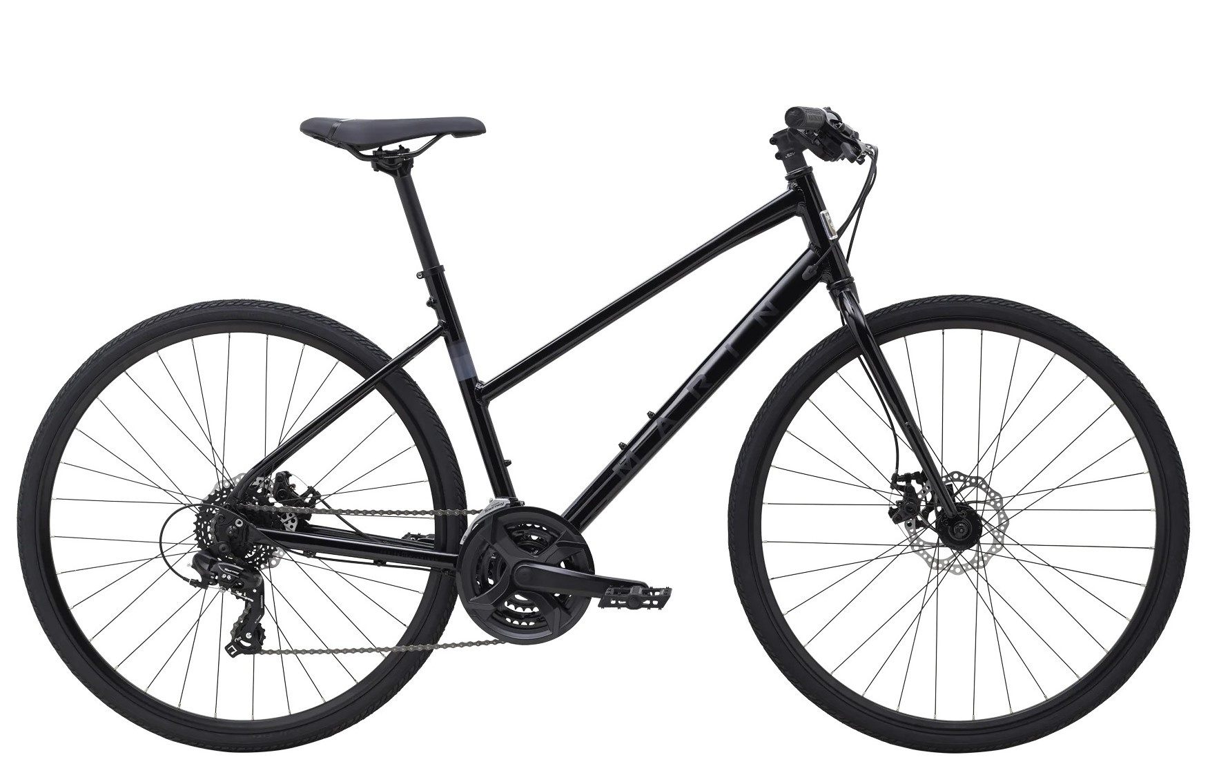 The Fairfax 1 is the most affordable in the collection. Named “Best Hybrid” many years running by Wirecutter it’s built around a lightweight Series 1 aluminum frame and a sturdy CrMo fork and comes with a 3x7-speed Shimano drivetrain, Tektro mechanical disc brakes and plenty of reliable Marin components.